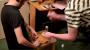 黒いシャツを着た男性が立っている。彼は、台の上に自らのペニスを置き、引っ張った包皮にナイフの刃を当てている。すると、その刃を別の男が木槌でパンッと打った。